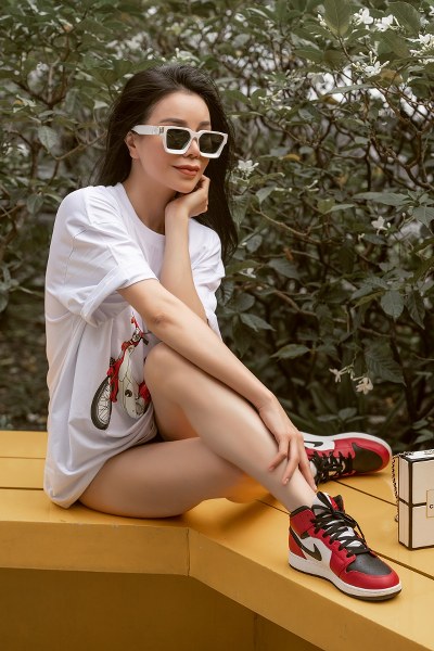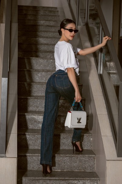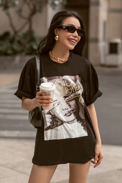 Thời trang dạo phố hài hòa không khí mùa nắng của Trà Ngọc Hằng là phối áo phông với chân váy và quần jeans.