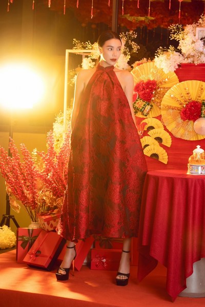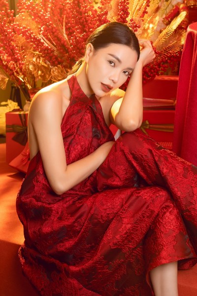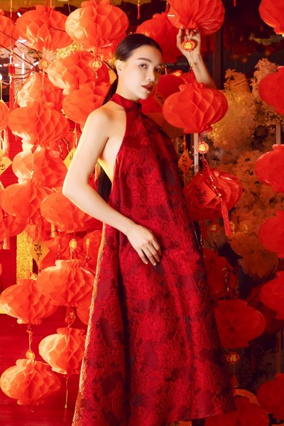 Nữ diễn viên, ca sĩ diện đầm cổ yếm vải gấm màu đỏ thắm, khoe dáng trong concept Tết đỏ rực với đèn lồng, hoa mai vàng...