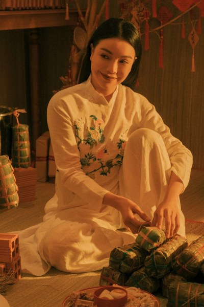 Không những vậy, nữ diễn viên còn mang đến hình ảnh gợi nhớ Tết xưa qua bộ ảnh khác - khi cô diện áo dài trắng kem nền nã tham gia những hoạt động quá đỗi thân quen với hàng triệu gia đình Việt Nam.