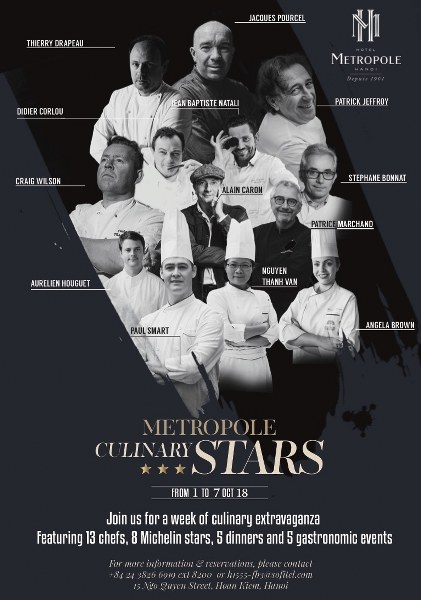 Tuần lễ ẩm thực Metropole Culinary Stars 2018 sẽ có sự góp mặt của Jacques Pourcel (đầu bếp 3 sao Michelin đến từ nhà hàng Le Jardin des Sens, Pháp), Thierry Drapeau (đầu bếp 2 sao Michelin từ nhà hàng Thierry Drapeau, Pháp), Patrick Jeffroy (đầu bếp 2 sao Michelin từ nhà hàng Patrick Jeffroy, Pháp), Jean Baptise Natali (đầu bếp 1 sao Michelin từ nhà hàng La Montagne, Pháp), Alain Caron (Giám khảo Master Chef tại Hà Lan và là chủ nhà hàng Café Caron ở Amsterdam), Stéphane Bonnat (đến từ Bonnat Chocolatier, nhà sản xuất sô-cô-la đầu tiên trên thế giới), Patrice Marchand (đồng sở hữu một trong những nhà máy sản xuất pho mai chất lượng đẳng cấp tại Pháp), Craig Wilson (thành viên Masterchefs Anh Quốc, chủ sở hữu nhà hàng được giải thưởng 2 AA rosette Eat on the Green ở Scotland), Didier Corlou (người thắng giải Master Chef ở Pháp, và là chủ nhà hàng La Verticale, Madame Hien và nhiều nhà hàng khác ở Việt Nam), Paul Smart (đầu bếp đã 2 lần đoạt giải Iron Chef tại Thái Lan và hiện là Bếp trưởng của khách sạn Metropole Hà Nội), Aurélien Houguet (Bếp trưởng nhà hàng angelina của Metropole Hà Nội), Nguyễn Thanh Vân (người phụ nữ Việt Nam đầu tiên là thành viên của Viện Hàn lâm ẩm thực Pháp và là Bếp phó của khách sạn Metropole Hà Nội), Angela Brown (Bếp trưởng đến từ khách sạn Raffles Siem Reap).