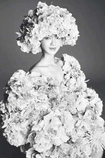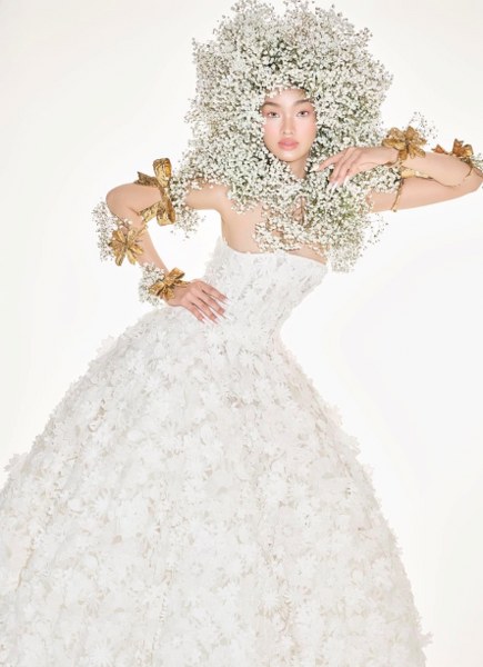Cô lựa chọn trang phục nhẹ nhàng, phong cách trang điểm ngọt ngào, trong veo, kết hợp kiểu tóc đính kết hoa tươi độc đáo.