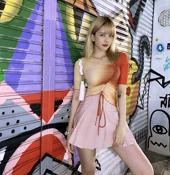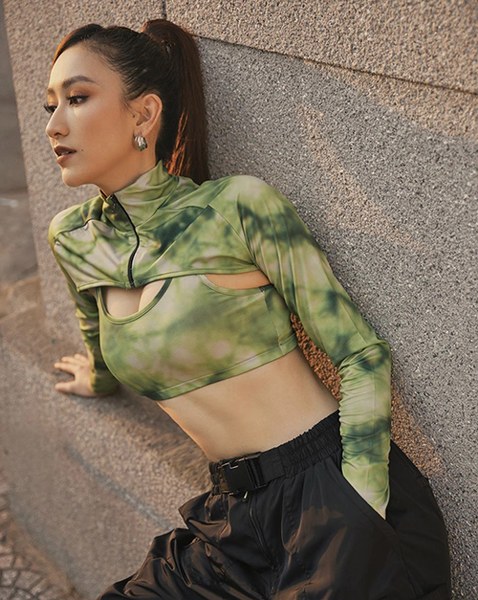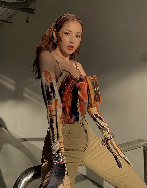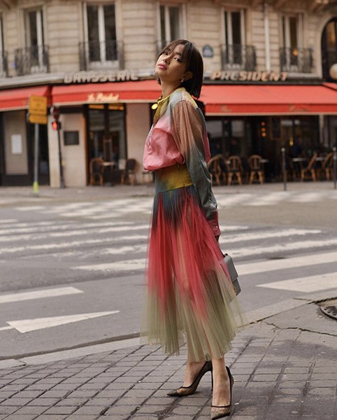 Váy áo nhuộm màu bất quy tắc cũng được Châu Bùi lựa chọn để giúp cô nổi bật trên phố.