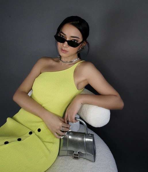 Váy dệt kim hợp mốt mùa thu giúp Châu Bùi tôn đường cong hình thể và bờ vai gầy, làn da rám nắng khoẻ khoắn.