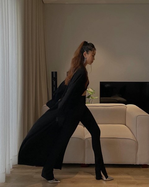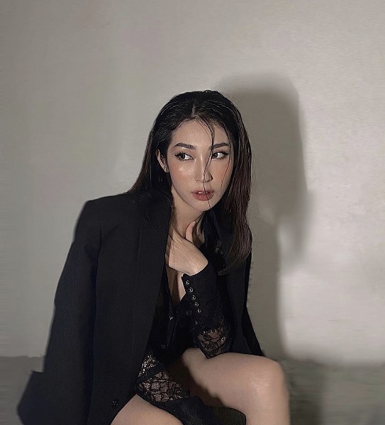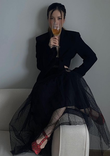 Áo blazer đen kiểu dáng thanh lịch được Khổng Tú Quỳnh mang tới sự mới mẻ bằng cách kết hợp cùng sơ mi ren xuyên thấu.