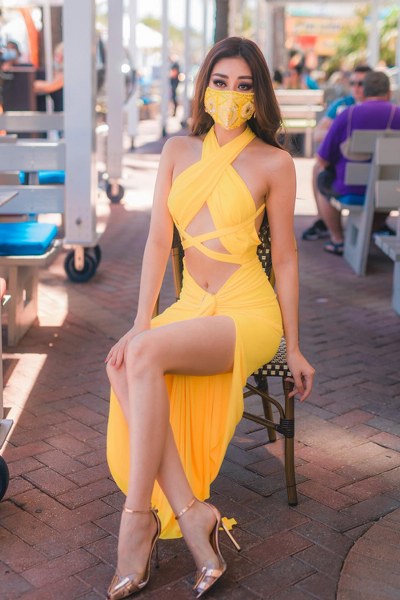 Khẩu trang có sắc màu và họa tiết đồng điệu với trang phục được Khánh Vân chuẩn bị kỹ lưỡng khi đi thi Miss Universe.