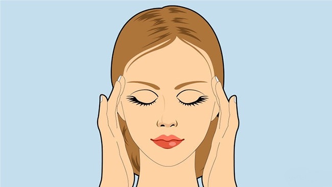 Đầu tiên, mát xa hai bên thái dương theo các chuyển động tròn từ trong ra ngoài.