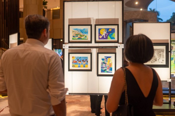 Khu vực trưng bày tranh vẽ bởi các em nhỏ được hỗ trợ bởi Saigon Children's Charity tại triển lãm H.U.E - Giáo dục khai mở ước mơ năm 2024