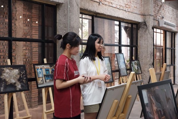 Hình ảnh người tham gia Triển lãm ngắm nhìn các tác phẩm trưng bày. Khu vực trưng bày được chia thành các trạm “Quang”, “Tĩnh”, “Ẩn”, “Khoảnh khắc” tương ứng với những trạm tàu của chuyến tàu theo bối cảnh ga Hà Nội đã chọn.