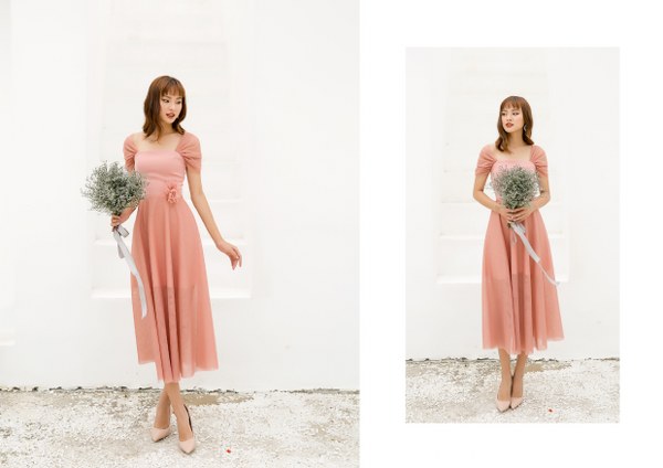 Tone màu misty rose trên nền chất liệu voan và Vitex cao cấp, nhẹ nhàng vẫn tôn lên vẻ đẹp duyên dáng cho nàng dâu