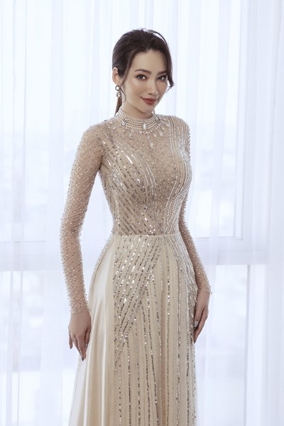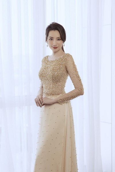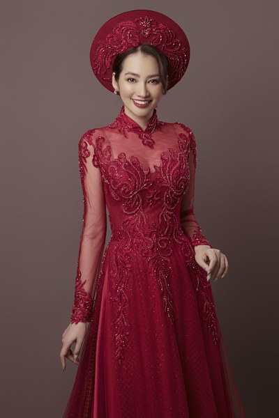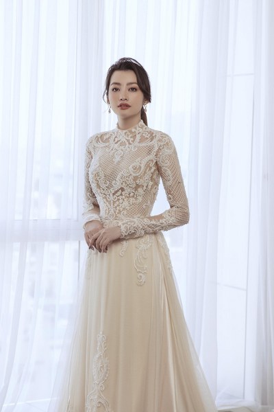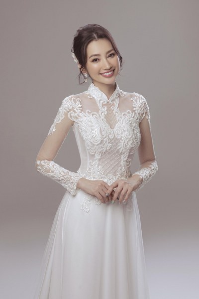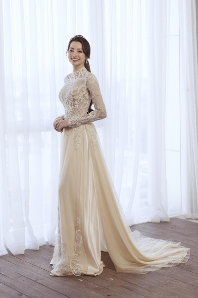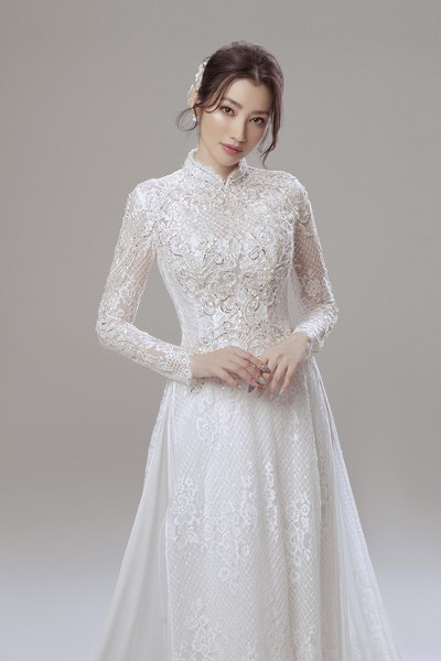 Trúc Diễm khoe dáng trong áo dài cách điệu đính ren, hạt bắt sáng mang phom dáng váy cưới hiện đại từ NTK Minh Châu.