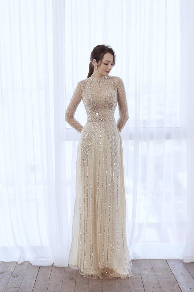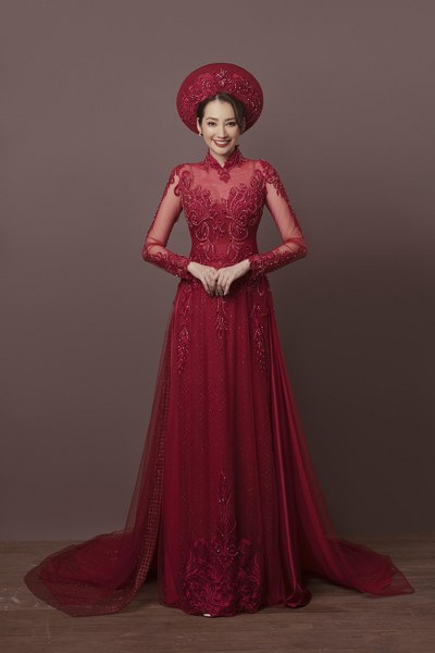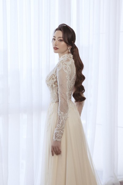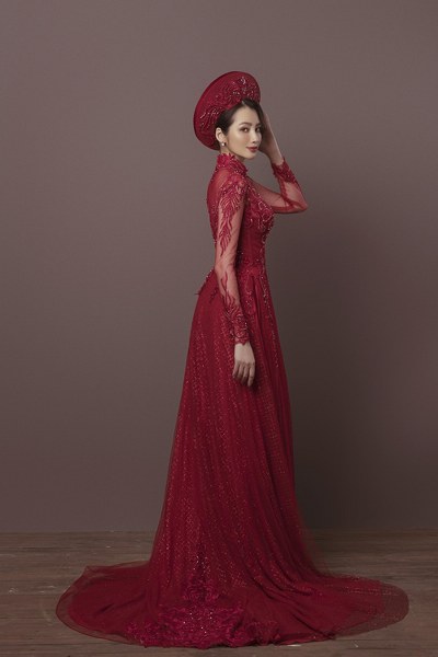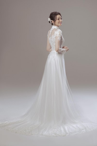 Bộ cánh có cổ trang sức theo kiểu váy cưới, phần thân trên của áo được may thêm vải lót tiệp màu da, giúp nàng dâu gợi cảm mà vẫn giữ sự an toàn của trang phục.