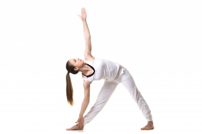Trikonasana, hoặc Tư thế tam giác sẽ mở rộng và làm đứng ngực, giúp kéo giãn cột sống, cải thiện lưu lượng máu.