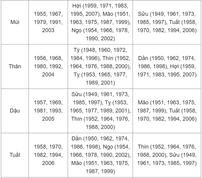 - Tuổi Mùi: Ất Mùi (1955, 2015), Đinh Mùi (1967), Kỷ Mùi (1979), Tân Mùi (1991), Quý Mùi (2003)