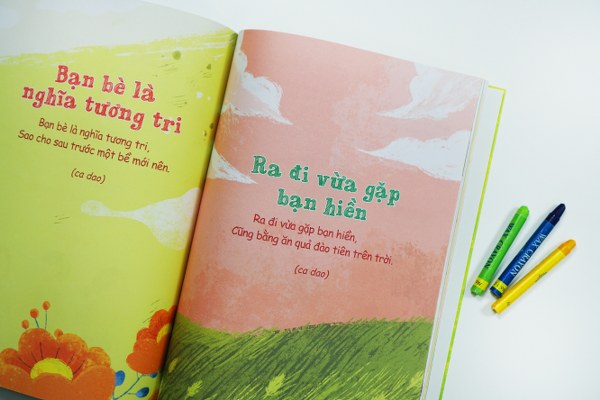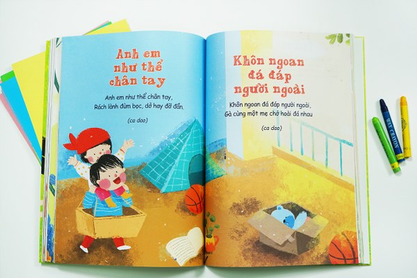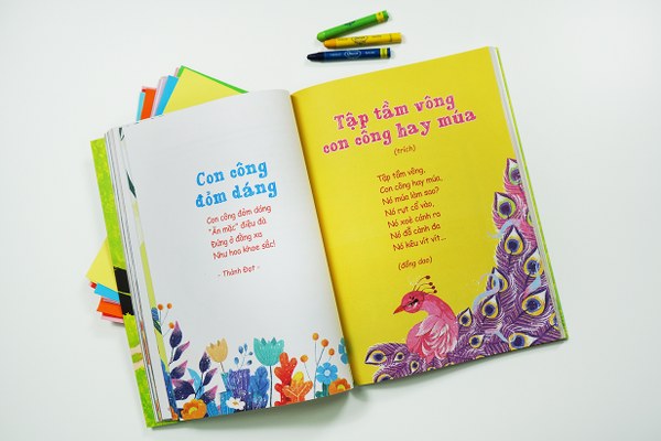 Mở cuốn sách đặc biệt này ra, bố mẹ sẽ bắt gặp rất nhiều những bài ca dao, đồng dao quen thuộc và cả những bài thơ của các tác giả trẻ hiện nay.