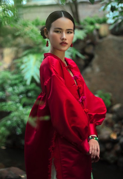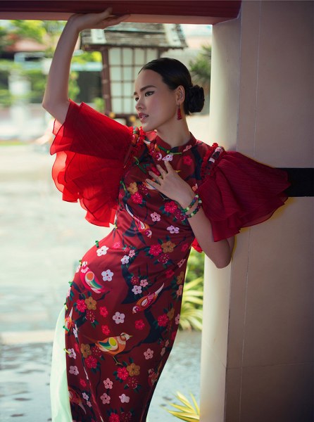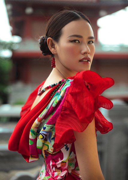 Á quân VN\'s Next Top Model mùa đầu tiên điệu đà làm duyên với các thiết kế màu sắc rực rỡ, họa tiết đậm nét văn hóa Việt.
