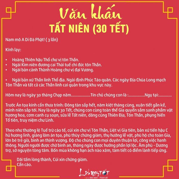 Mâm cơm cúng tất niên được người Việt dâng lên tổ tiên vào ngày 30 tháng 12 âm lịch – ngày cuối cùng của năm để tạ ơn tổ tiên. Bài cúng tất niên là một phần không thể thiếu trong lễ này.