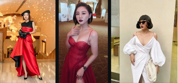 Văn Mai Hương thử nghiệm trang phục gợi cảm với đầm cúp ngực, xẻ tà, cut out, trang điểm đậm nhấn vào môi và mắt.