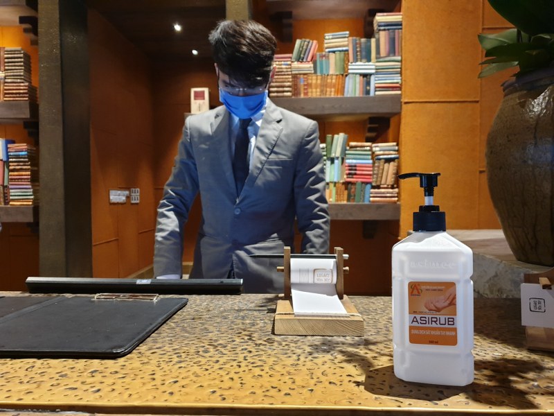 Dung dịch sát khuẩn tay được đặt tại nhiều vị trí như cửa vào, lễ tân Legacy Yên Tử, lễ tân Làng Nương, quầy soát vé…