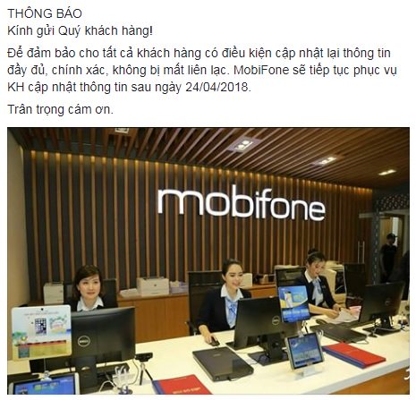 Phía nhà mạng MobiFone cũng đưa ra thông báo trên trang facebook chính thức với thông điệp: "Để đảm bảo cho tất cả khách hàng có điều kiện cập nhật lại thông tin đầy đủ, chính xác, không bị mất liên lạc. MobiFone sẽ tiếp tục phục vụ KH cập nhật thông tin sau ngày 24/04/2018".