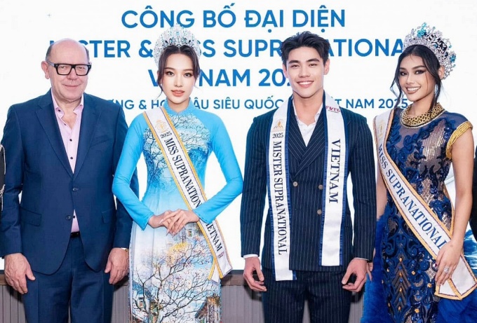 Từ trái qua gồm Chủ tịch Miss Supranational - Von Lipinski, Hoa hậu Võ Cao Kỳ Duyên, người mẫu Hà Quang Trung và Miss Supranational 2024 - Harashta Haifa Zahra, tại sự kiện công bố ở Hà Nội (Ảnh: Miss Supranational Vietnam)