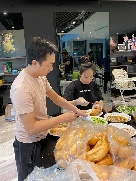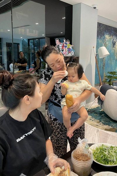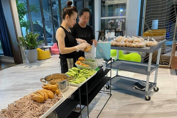 Vợ chồng Cường Đôla - Đàm Thu Trang cùng người thân chuẩn bị hàng trăm ổ bánh mì, gửi tặng người dân TP HCM có hoàn cảnh khó khăn, sáng 21/8.