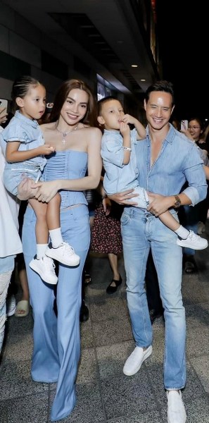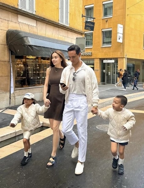 Trang phục dạo phố với tông màu be theo phong cách thanh lịch. Bé Lisa và Leon cùng mặc sweatshirt theo phong cách preppy. Hà Hồ chọn váy midi lụa màu kem, kết hợp sandals quai mảnh theo phong cách thập niên 1990. Kim Lý phối blazer màu kem cùng quần và giày loafer nâu.