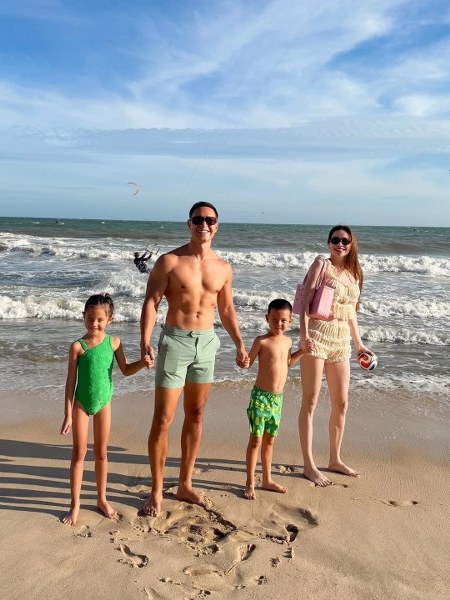 Trong lần đi du lịch đầu tháng 1, khi dạo chơi trên biển, ba bố con diễn viên Kim Lý diện trang phục sắc xanh. Hà Hồ chọn bộ đồ xếp bèo và bo chun lấy cảm hứng từ nội y thời kỳ Victoria, phối túi nhựa màu hồng, tạo vẻ nữ tính.