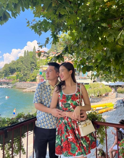 Khi đi du lịch, vợ chồng Hoa hậu chọn các thiết kế in họa tiết và có tông màu bắt mắt hơn. Trong một chuyến du lịch châu Âu, cả hai cùng mặc trang phục họa tiết thiên nhiên. Chồng cô chọn áo polo hình xương rồng, Mỹ Linh phối váy hoa lá với túi Kelly màu vàng bơ của Hermes.