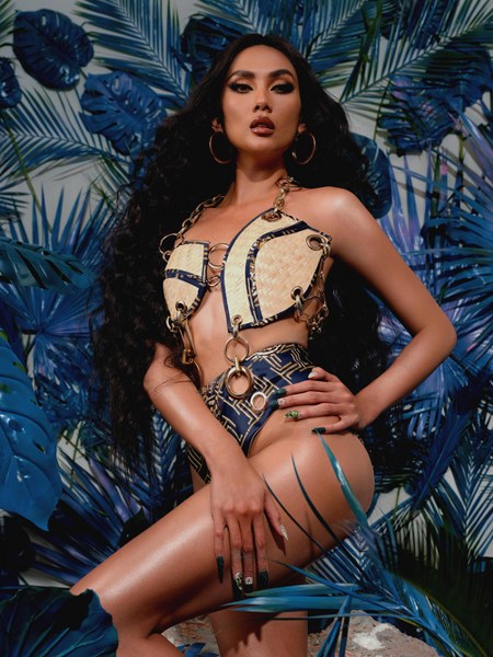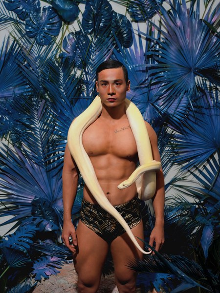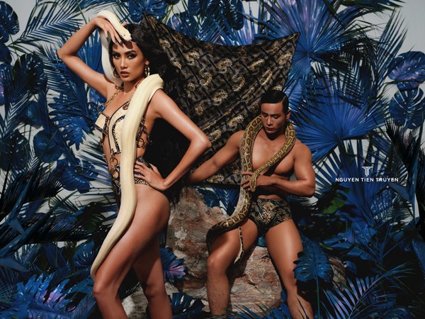 Siêu mẫu Võ Hoàng Yến diện swimsuit gợi cảm, tạo dáng cùng trăn gấm khi chụp ảnh quảng bá cho show diễn của Nguyễn Tiến Truyển.
