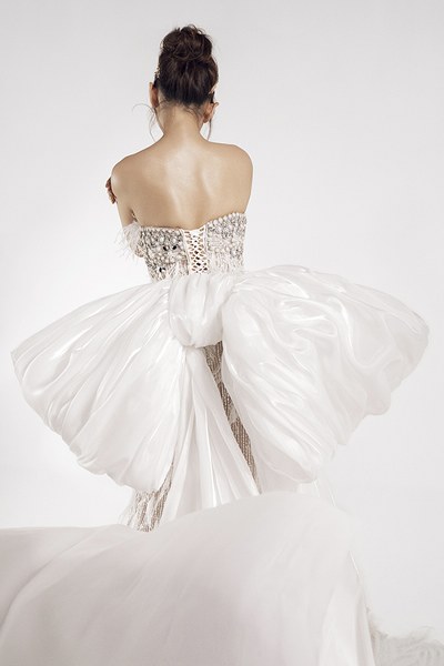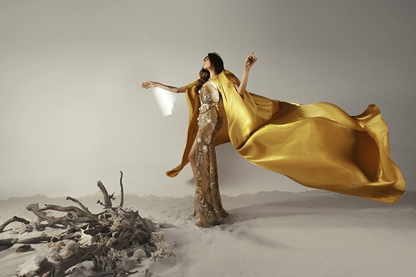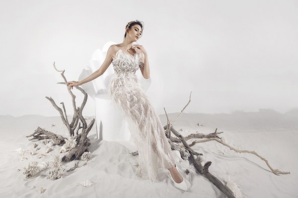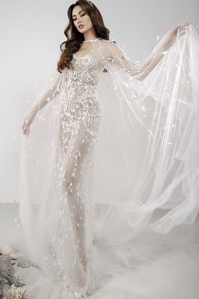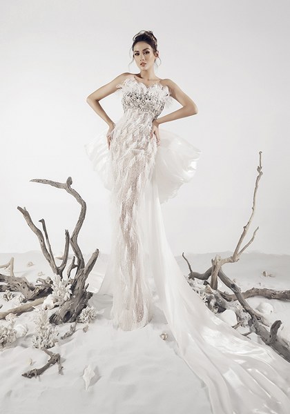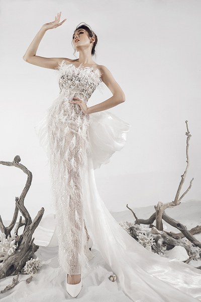 Thiết kế gây ấn tượng mạnh với kỹ thuật thêu, dệt sợi tỉ mỉ, các chi tiết đá Swarovski lấp lánh, lông vũ mềm được đính kết trên từng hoa voan ren.