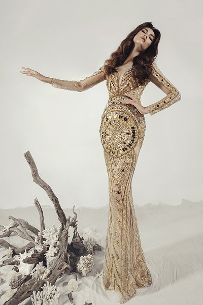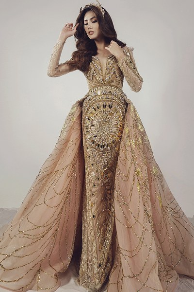 Võ Hoàng Yến đã diện 5 váy cưới gây ấn tượng bởi hiệu ứng điêu khắc ren cùng kỹ thuật dát vàng thủ công, đính kết lông vũ và pha lê Swarovski.