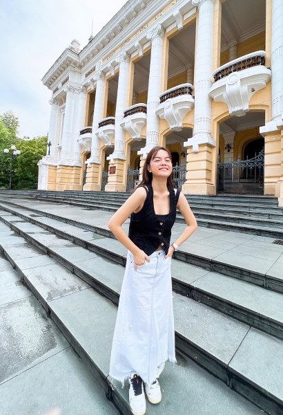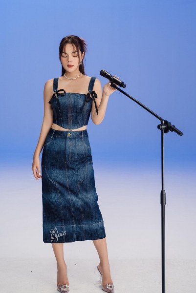 Hôm 19/5, cô tung bộ ảnh diện crop top cùng chân váy denim, phối vòng cổ ngọc trai.