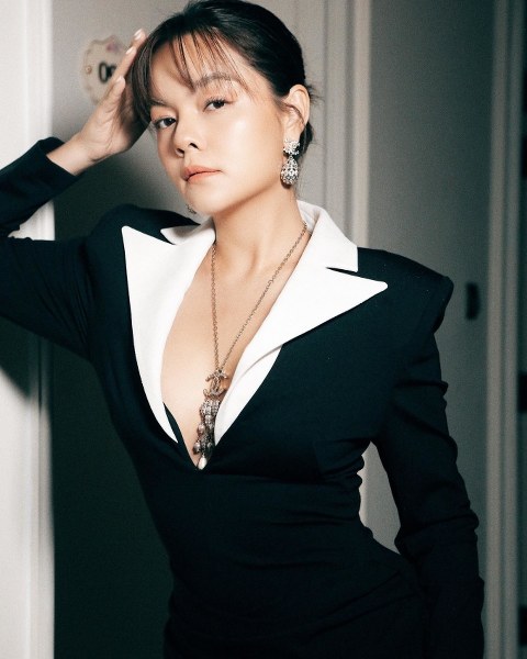 Phạm Quỳnh Anh tạo dáng với đầm cách điệu kiểu cổ vest. Ở tuổi 38, làm mẹ của ba con gái gồm Tuệ Lâm (10 tuổi), Tuệ An (năm tuổi), Tuệ Nhi (gần một tuổi), ca sĩ được khen ngày càng gợi cảm.