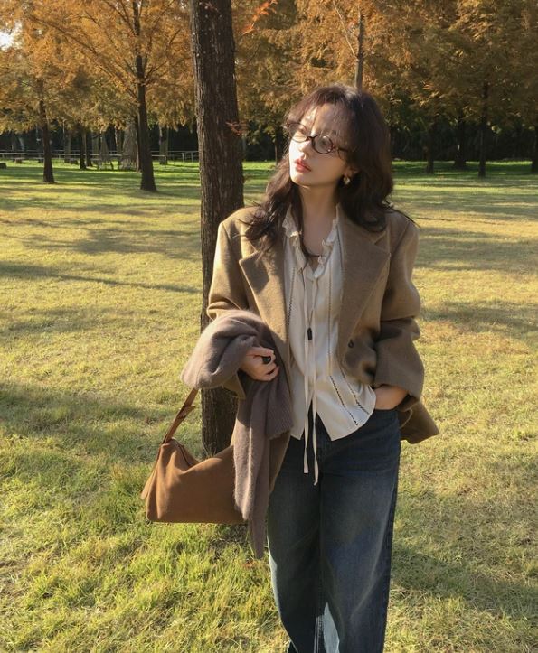Áo blazer sắc nâu trầm mang đến vẻ ngoài chững chạc, bên trong là áo sơ mi trắng hoặc sáng màu tạo sự chuyên nghiệp. Khi kết hợp với quần jeans ống suông sẽ giúp tổng thể thêm phần hiện đại. Ưu tiên các gam màu trung tính để dễ phối đồ và tạo cảm giác sang trọng mà không quá rối mắt