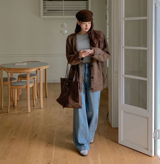 Áo cardigan dáng rộng màu nâu trầm với chất liệu len dệt mềm rủ nhẹ theo chuyển động cơ thể, lớp áo thun xám bên trong đóng vai trò trung hòa bảng màu. Kết hợp với quần jeans xanh nhạt ống rộng cạp cao, loạt phụ kiện tối giản như mũ nồi và túi xách da tông nâu đồng điệu, mang đậm hơi thở đời thường nhưng vẫn đủ tinh tế