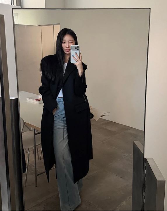 Chiếc áo dạ dáng dài màu đen với đường cắt may gọn gàng ôm vừa thân trên, thả suông xuống phần thân dưới, mang lại cảm giác chỉn chu trong những ngày thời tiết lạnh sâu. Bên trong, quần jeans tối màu dáng suông được phối khéo léo, không phá vỡ sự trang nhã của áo khoác. Sự kết hợp này giúp cân bằng giữa tính ứng dụng và tính thẩm mỹ, tránh cho trang phục trở nên quá cứng nhắc