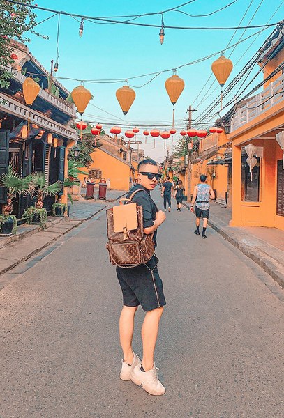 Vũ Khắc Tiệp đeo ba lô hàng hiệu đi thăm phố cổ Hội An. Anh vừa trải qua đợt cách ly dài gần 2 tháng vì Covid-19 nên cảm thấy rất phấn chấn khi được tự do đi đây đi đó trở lại.