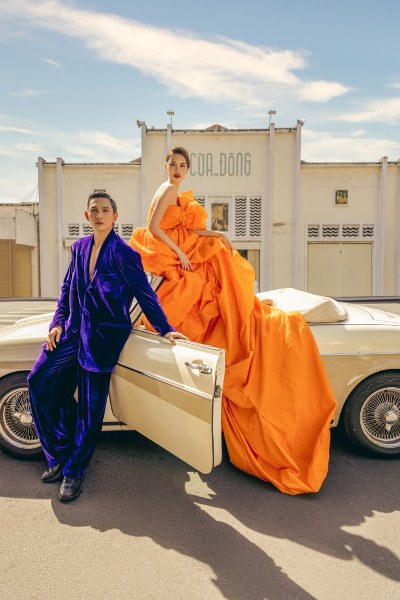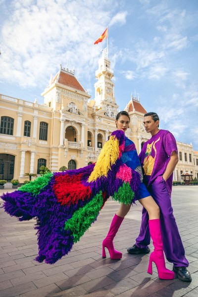 Các mẫu váy áo sử dụng gam màu nổi như hồng, cam, đỏ, họa tiết hoa đính kết 3D, thêu thủ công. Hai nhà thiết kế nói: "Qua dự án, chúng tôi muốn giới thiệu về TP HCM hiện đại nhưng vẫn giữ được vẻ đẹp văn hóa, lịch sử đến nhiều người, nhất là du khách quốc tế".