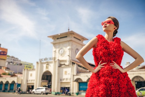 Người mẫu tạo dáng với váy đính hoa, chụp ảnh trước chợ Bến Thành - điểm đến quen thuộc của nhiều khách du lịch.