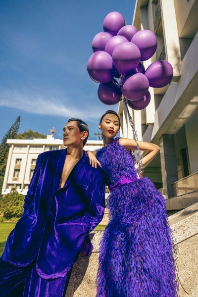 Trong ảnh, mẫu nữ diện đầm lông vũ, còn suits oversize chất liệu nhung dành cho nam.