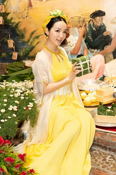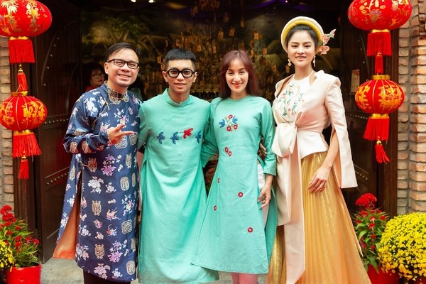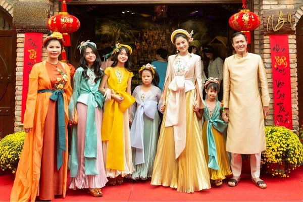 Vợ chồng Vũ Thu Phương cùng bốn con gái và mẹ ruột diện trang phục truyền thống