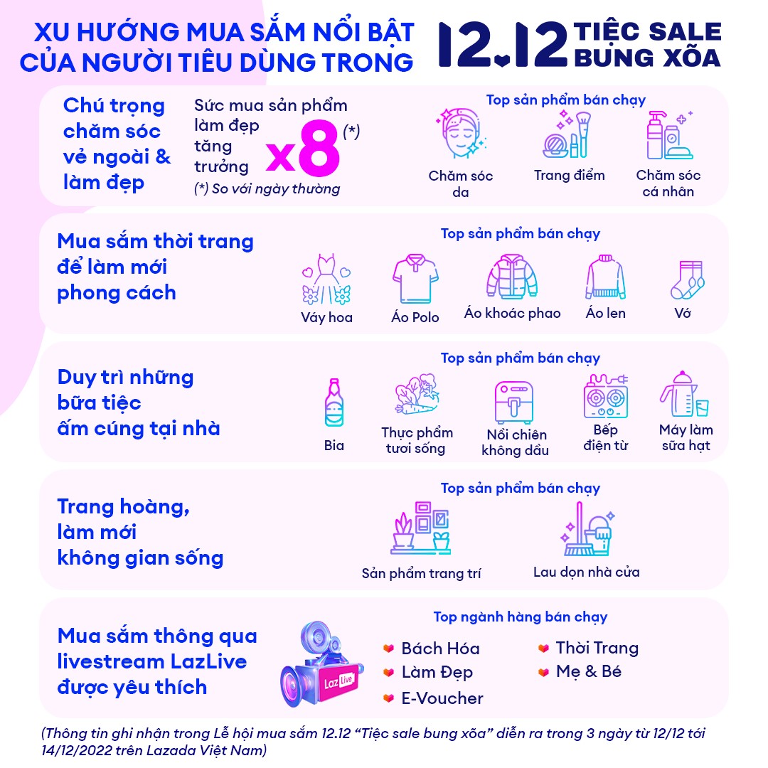 Bên cạnh việc mua sắm đơn thuần, người dùng cũng hào hứng đón xem chuỗi livestream trên kênh LazLive của Lazada xuyên suốt Lễ hội mua sắm 12.12 để giải trí và thu thập thêm nhiều bí kíp hữu ích, cần thiết cho mùa cuối năm. Mua sắm thông qua livestream cũng được người dùng yêu thích khi vừa được xem review sản phẩm trực quan từ các KOLs/KOCs, vừa săn được ưu đãi giá tốt, các voucher và quà tặng độc quyền chỉ có trong livestream. Do đó, các sản phẩm liên quan đến bách hóa, làm đẹp, e-voucher, thời trang và mẹ & bé đã ghi nhận lượt đơn hàng bán ra thông qua livestream tăng cao, phục vụ cho nhu cầu cuối năm và đón năm mới của người dùng.