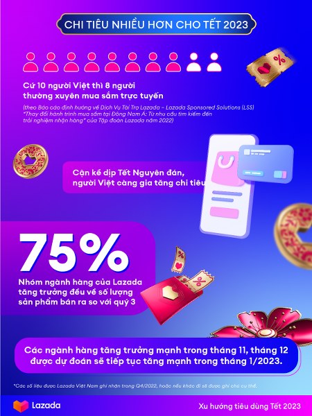 Dữ liệu từ Lazada Việt Nam trong quý 4 năm 2022 cũng thể hiện xu hướng này rõ rệt hơn khi: Càng về cuối năm, người Việt càng gia tăng chi tiêu. Cụ thể, hơn 75% nhóm ngành hàng của Lazada ghi nhận tăng trưởng đều về số lượng sản phẩm bán ra so với quý 3 năm 2022. Trong đó, hầu hết các ngành hàng ghi nhận sự tăng trưởng mạnh trong tháng 11, tháng 12 và được dự đoán sẽ tiếp tục gia tăng trong tháng 1 năm 2023.