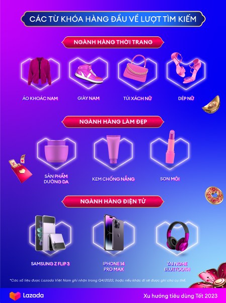 Người dùng Việt chi tiêu rộng rãi hơn cho các nhu cầu cá nhân và giải trí thay vì chỉ tập trung vào các sản phẩm thiết yếu. Theo ghi nhận từ Lazada Việt Nam trong quý 4 năm 2022, ngành hàng Thời trang, Điện tử và Làm đẹp là các nhóm ngành hàng được ưa chuộng nhất.