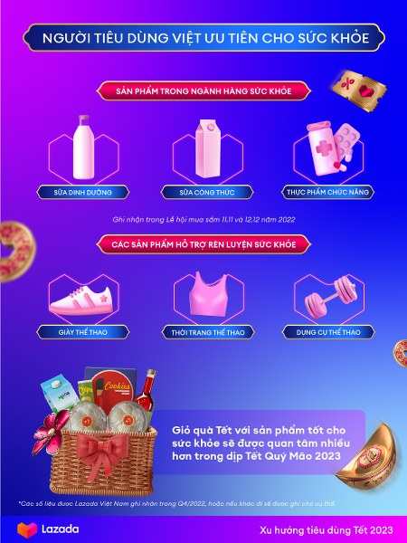Theo ghi nhận từ Lazada Việt Nam trong Lễ hội mua sắm 11.11 và 12.12 vừa qua, các sản phẩm trong ngành hàng chăm sóc sức khỏe luôn nằm trong top tăng trưởng như sữa dinh dưỡng, sữa công thức và thực phẩm chức năng. Song song đó, các sản phẩm như giày, quần áo và các dụng cụ thể thao cũng ghi nhận lượng mua sắm lớn trong quý 4 năm 2022.