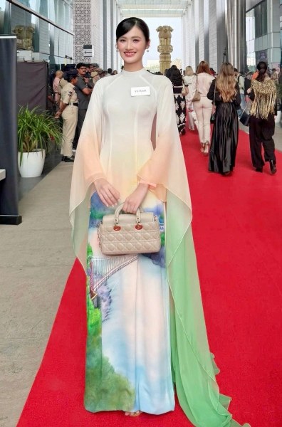 Ý Nhi diện áo dài lên thảm đỏ sự kiện thuộc khuôn khổ Miss World 2025