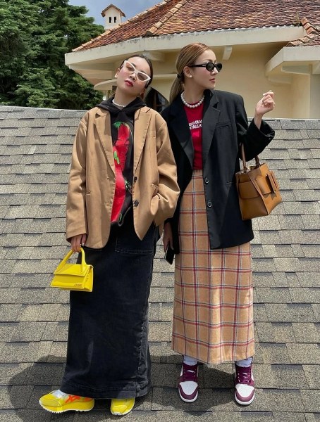 Khi đi du lịch Hàn Quốc, họ cùng chọn áo khoác denim kết hợp váy maxi và sneakers.