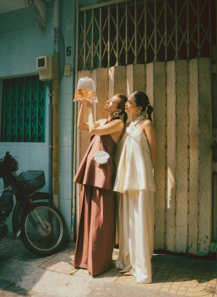 Cả hai mặc bộ áo yếm giống nhau, chỉ khác màu. Họ để tóc đuôi ngựa, đeo trang sức bản lớn theo phong cách thập niên 1980.