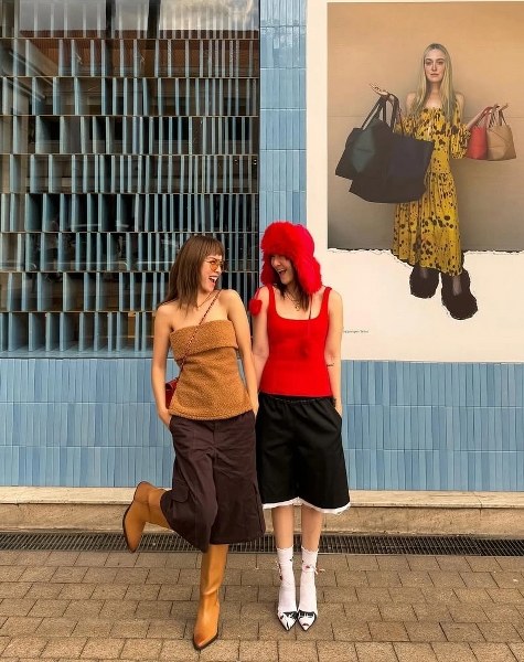 Phong cách Y2K được Yến Trang xây dựng thông qua bộ đồ tông đỏ, trắng, đen gồm áo khoác tay đua, quần shorts, giày búp bê thể thao. Yến Nhi phối quần đạp xe cùng áo khoác tay thụng, mang giày giống chị.