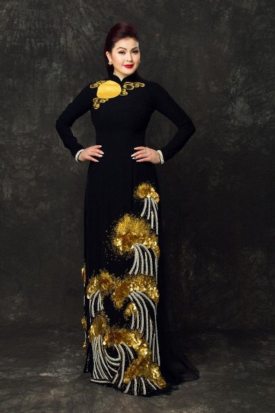 Yến Vy diện trang phục áo dài phom truyền thống được thêu họa tiết dọc thân, đính kết hạt cườm quanh hoa văn. Với họa tiết hoa sen đính các hạt đá cùng tông màu, tạo độ bắt sáng khi di chuyển Yến Vy cực kỳ yêu thích. Yến Vy thổ lộ, cô thích những thiết kế của đàn em vì vẫn giữ phom truyền thống như cổ trụ, chít eo…